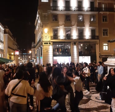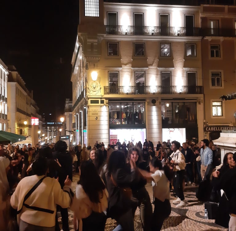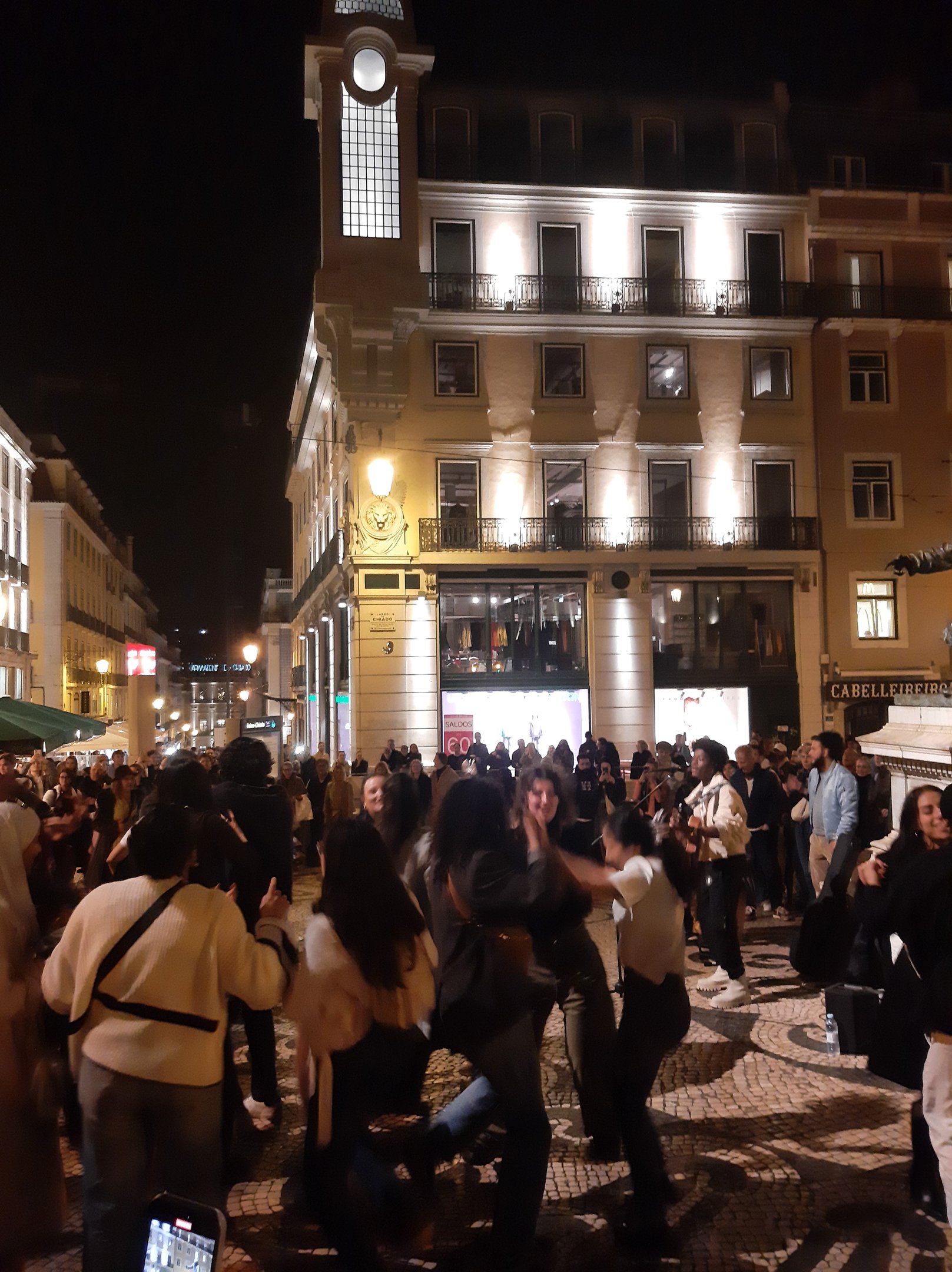 O grupo de pessoas dançando à sua frente em meio ao círculo aumentava e todos que ali estavam viraram um grupo só de dançarinos entusiasmados: uma jovem dançando com um senhor vestido de capitão de um navio, amigas dançando em grupos, um senhor que permanecia bem à sua frente, fantasiado com roupas do Brasil, vibrando e dançando com suas músicas livremente e divertidamente, famílias dançando em conjunto, um casal em que a mulher estava vestida com uma camisa que tinha a estampa da frase “I S2 Lisbon”, uma senhora vestida de burca entusiasmada com a música em passos tímidos e um sorriso permanente no rosto, uma jovem asiática que contagiava-o também com sua graciosidade, alegria e espontaneidade em seus passos. Ao fundo, avistou uma brasileira em meio a multidão, quietinha, observando tudo. Seu sorriso tímido não conseguia esconder a grandeza do brilho em seu olhar ao absorver aquele momento e Lucas só ficava imaginando o que acontecia dentro daquele coração que transbordava visivelmente no rolar de suas lágrimas pelo rosto daquela mulher. O furacão que a movimentava internamente naquele instante era visível mesmo de onde ele estava.